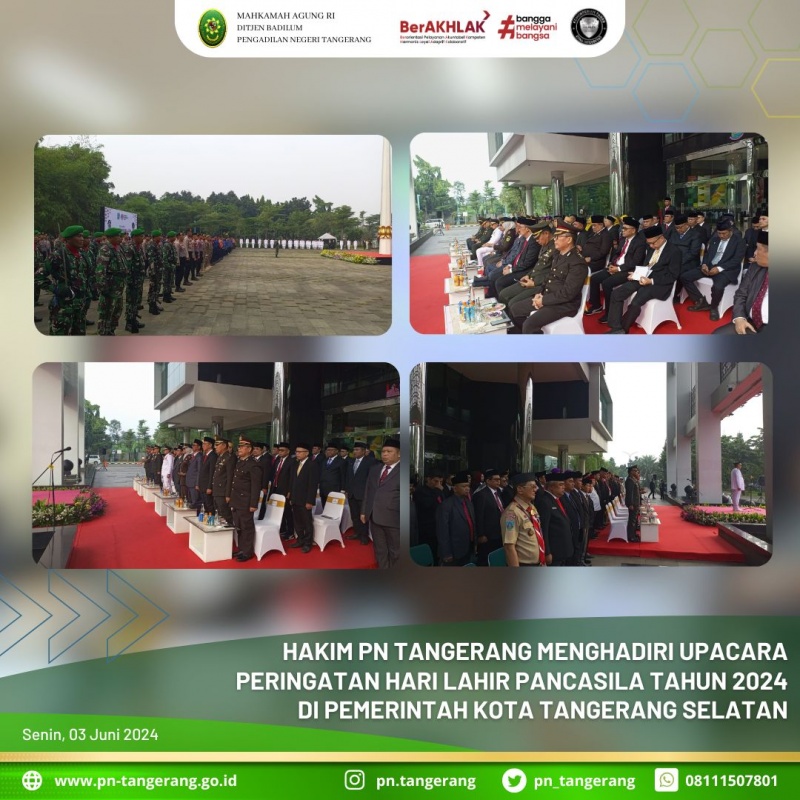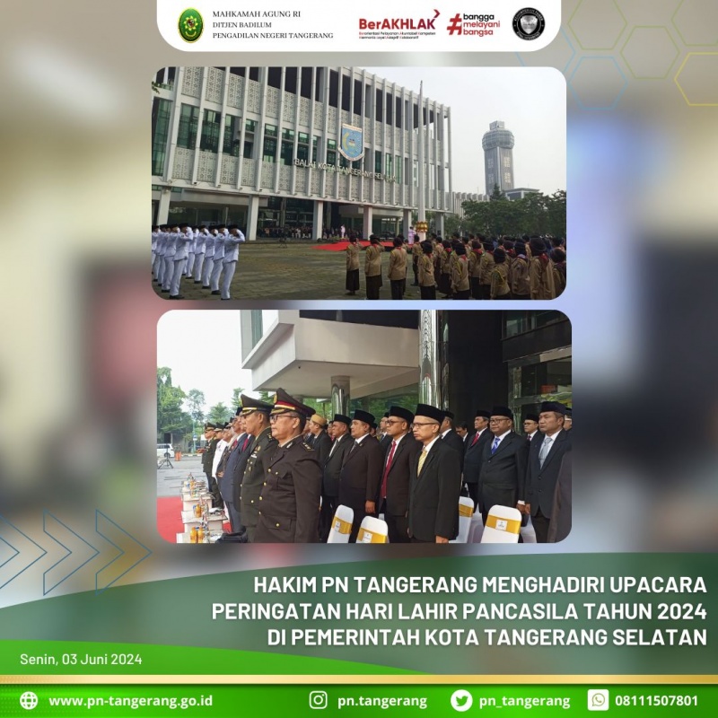 Berdasarkan surat undangan dari Walikota Tangerang Selatan, Bertempat di Pusat Pemerintahan Kota Tangerang Selatan, Ketua Pengadilan Negeri Tangerang Kelas 1A Khusus, yang diwakili oleh Hakim Yandri Roni, S.H., M.H., menghadiri dan mengikuti rangkaian kegiatan Upacara Peringatan Hari Lahir Pancasila 2024.