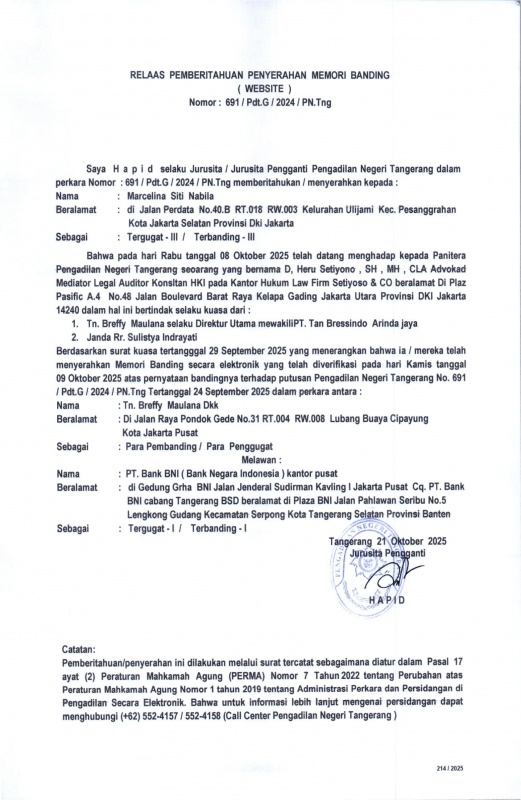 RELAAS PEMBERITAHUAN PENYERAHAN MEMORI BANDING NOMOR: 691/PDT.G/2024/PN.TNG (MARCELINA SITI NABILA)