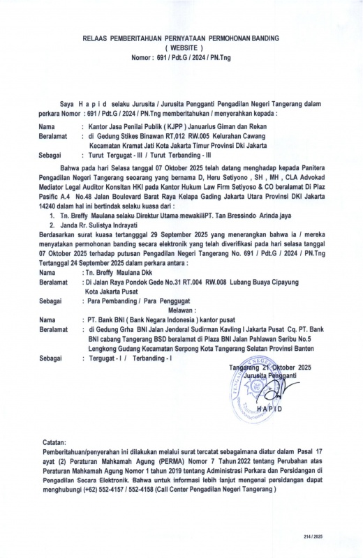 RELAAS PEMBERITAHUAN PERNYATAAN PERMOHONAN BANDING NOMOR: 691/PDT.G/2024/PN.TNG (KANTOR JASA PENILAI PUBLIK (KJPP) JANUARIUS GIMAN DAN REKAN)
