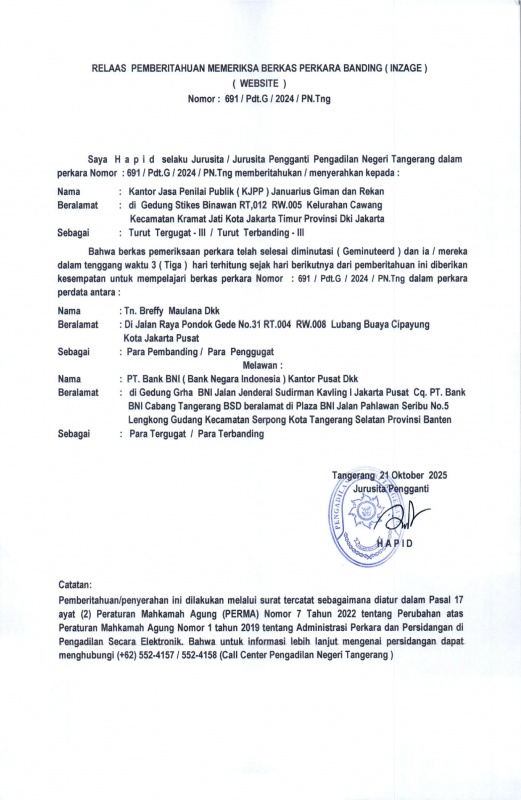 RELAAS PEMBERITAHUAN MEMERIKSA BERKAS PERKARA BANDING (INZAGE) NOMOR: 691/PDT.G/2024/PN.TNG (KANTOR JASA PENILAI PUBLIK (KJPP) JANUARIUS GIMAN DAN REKAN)