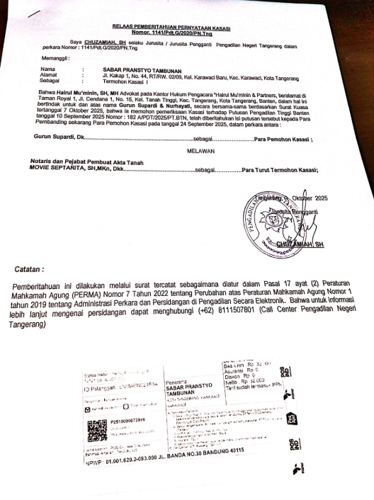 RELAAS PEMBERITAHUAN PERNYATAAN KASASI No. 1141/Pdt.G/2020/PN.Tng Kepada: Termohon Kasasi I (An. SABAR PRANSTYO TAMBUNAN)