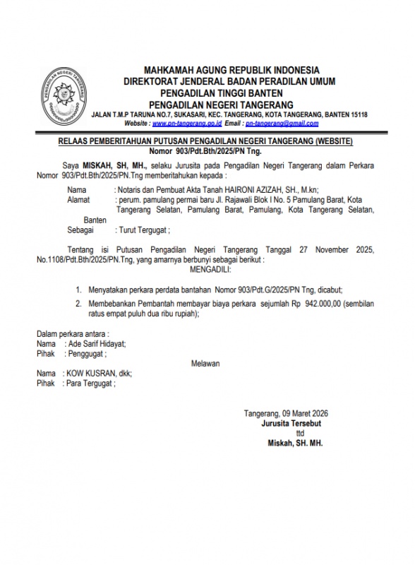 RELAAS PEMBERITAHUAN PUTUSAN PENGADILAN NEGERI TANGERANG NOMOR 903/PDT.BTH/2025/PN TNG. (HAIRONI AZIZAH)