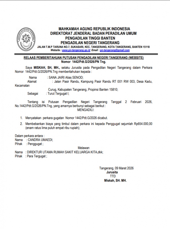 RELAAS PEMBERITAHUAN PUTUSAN PENGADILAN NEGERI TANGERANG NOMOR 1442/PDT.G/2026/PN TNG. (SANA JAIRI)