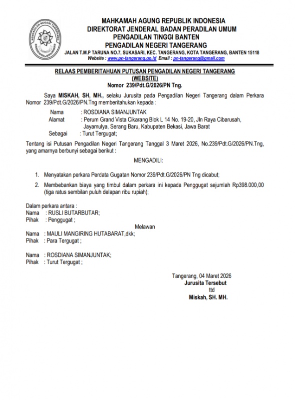 RELAAS PEMBERITAHUAN PUTUSAN PENGADILAN NEGERI TANGERANG NOMOR 239/PDT.G/2026/PN TNG (ROSDIANA SIMANJUNTAK)