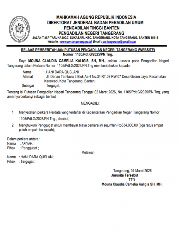 RELAAS PEMBERITAHUAN PUTUSAN PENGADILAN NEGERI TANGERANG NOMOR 1105/PDT.G/2025/PN TNG. (HANI DARA QUSLANI)
