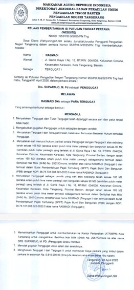 ELAAS PEMBERITAHUAN ISI PUTUSAN TINGKAT PERTАМА NOMOR: 953/PDT.G/2025/PN TNG (RASMADI)