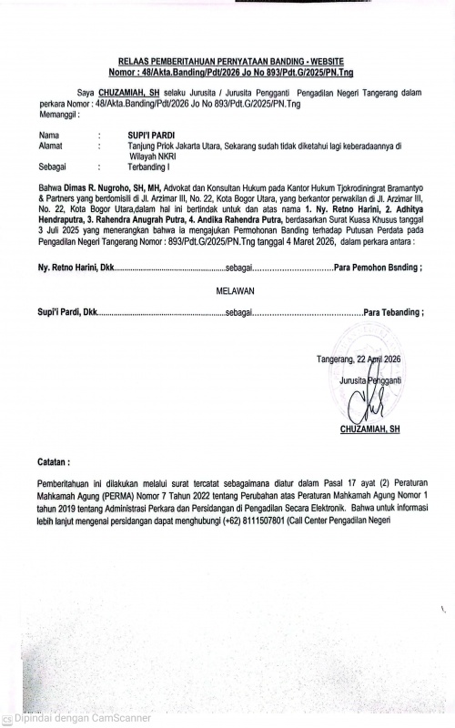 RELAAS PEMBERITAHUAN PERNYATAAN BANDING NOMOR : 48/AKTA.BANDING/PDT/2026 JO NO 893/PDT.G/2025/PN.TNG (SUPI'I PARDI)