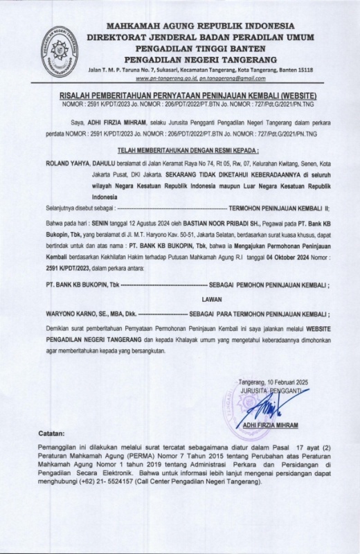 RELAAS PEMBERITAHUAN PERNYATAAN PENINJAUAN KEMBALI NO. 727/Pdt.G/2021/PN Tng KEPADA ROLAND YAHYA