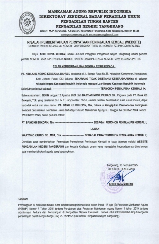 RELAAS PEMBERITAHUAN PERNYATAAN PENINJAUAN KEMBALI NO. 727/Pdt.G/2021/PN Tng KEPADA PT. KIBILAND AGUNG KENCANA