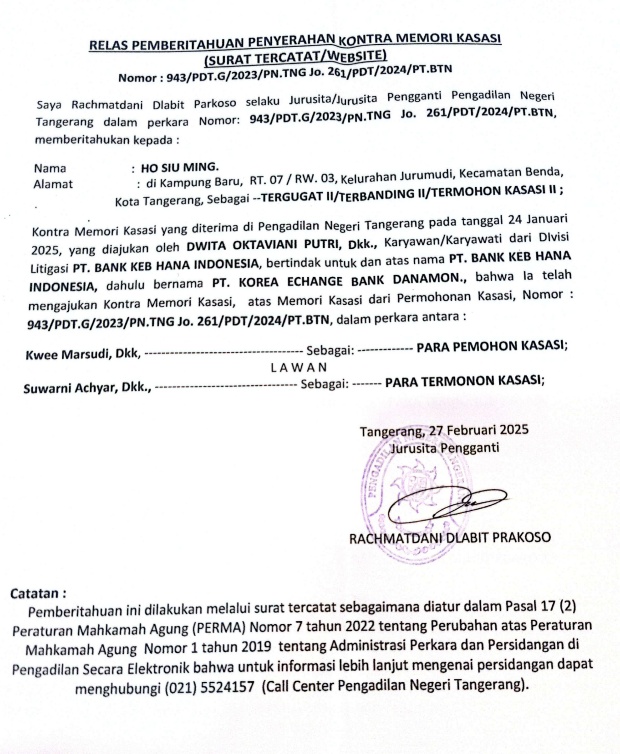 RELAAS PEMBERITAHUAN PENYERAHAN KONTRA MEMORI KASASI NO. 943/Pdt.G/2023/PN Tng jo No. 261/Pdt/2024/PT Btn (An. Ho Siu Ming)