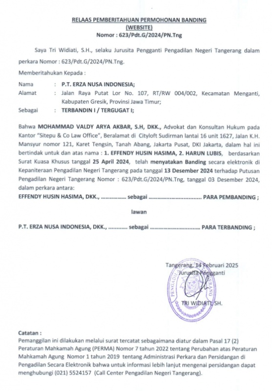 RELAAS PEMBERITAHUAN PERMOHONAN BANDING NO. 623/Pdt.G/2024/PN Tng KEPADA TERBANDING I / TERGUGAT I