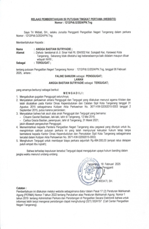 RELAAS PEMBERITAHUAN ISI PUTUSAN Nomor : 1212/G/2024/PN TNG (WEBSITE An. ANGGA)
