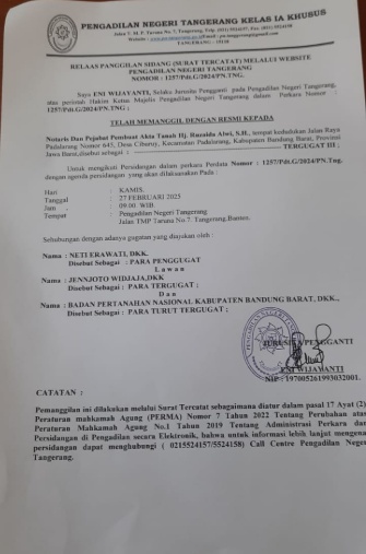 RELAAS PANGGILAN SIDANG (SURAT TERCATAT) MELALUI WEBSITE PENGADILAN NEGERI TANGERANG NO. 1257/PDT.G/2024/PN TNG KEPADA TERGUGAT III