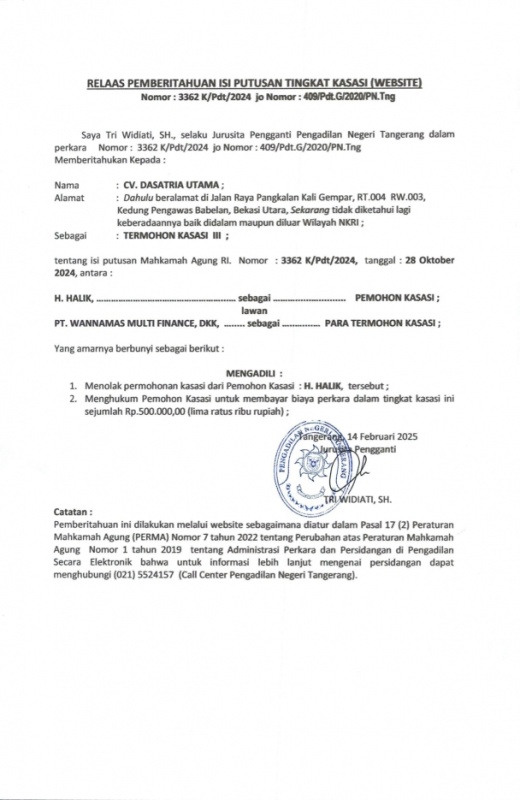 RELAAS PEMBERITAHUAN ISI PUTUSAN KASASI Nomor : 409/Pdt.G/2020/PN.Tng (WEBSITE An. CV DASATRIA UTAMA)