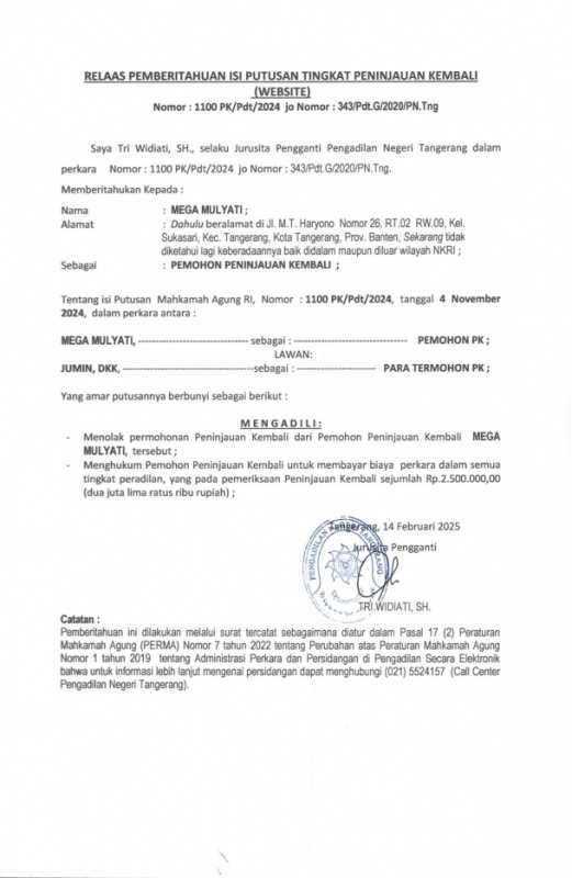 RELAAS PEMBERITAHUAN ISI PUTUSAN PENINJAUAN KEMBALI Nomor : 343/Pdt.G/2020/PN.Tng (WEBSITE An. MEGA)