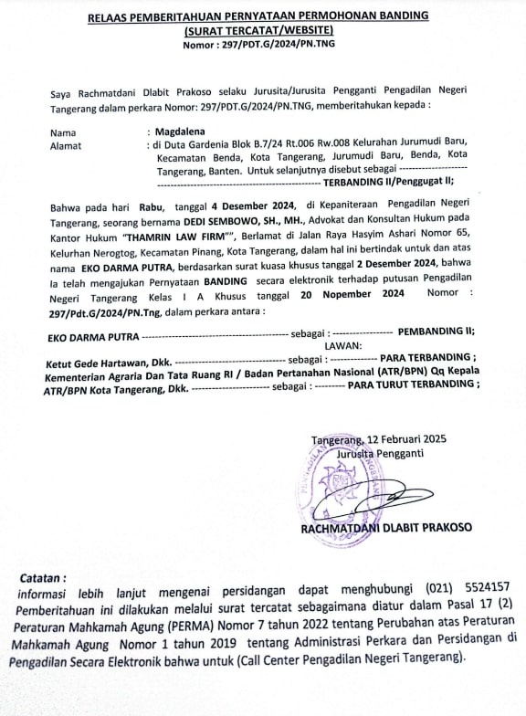RELAAS PEMBERITAHUAN PERNYATAAN PERMOHONAN BANDING (SURAT TERCATAT/WEBSITE) NO. 297/PDT.G/2024/PN TNG KEPADA TERBANDING II/PENGGUGAT II