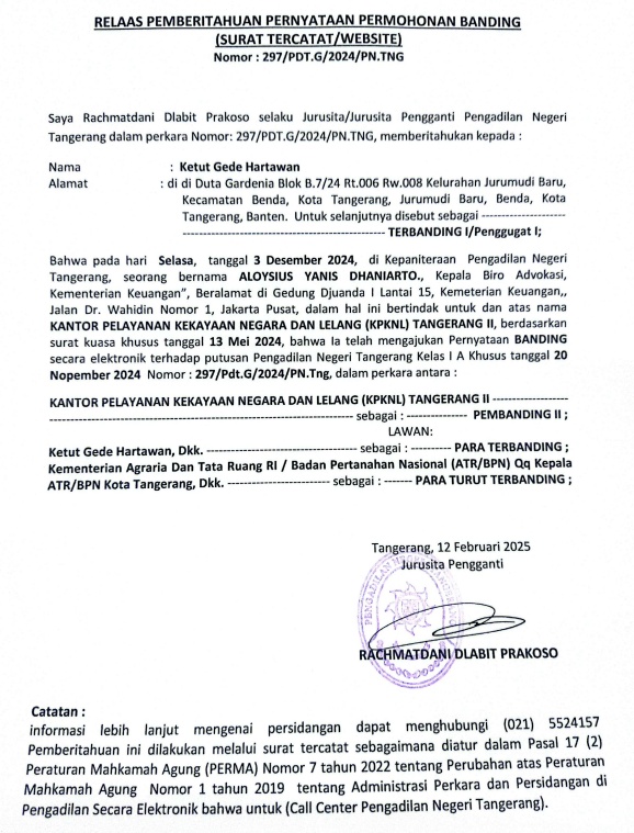 RELAAS PEMBERITAHUAN PERNYATAAN PERMOHONAN BANDING (SURAT TERCATAT/WEBSITE) NO. 297/PDT.G/2024/PN TNG KEPADA TERBANDING I/PENGGUGAT I