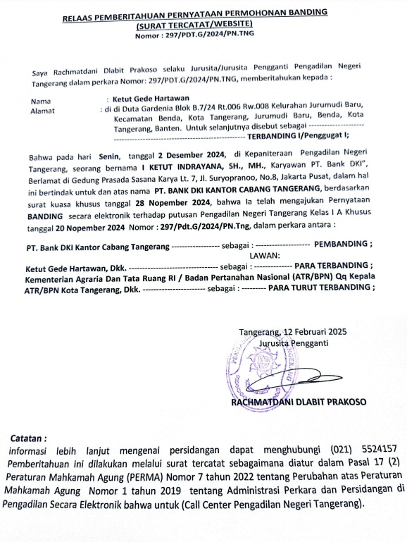 RELAAS PEMBERITAHUAN PERNYATAAN PERMOHONAN BANDING (SURAT TERCATAT/WEBSITE) NO. 297/PDT.G/2024/PN TNG KEPADA TERBANDING I/PENGGUGAT I
