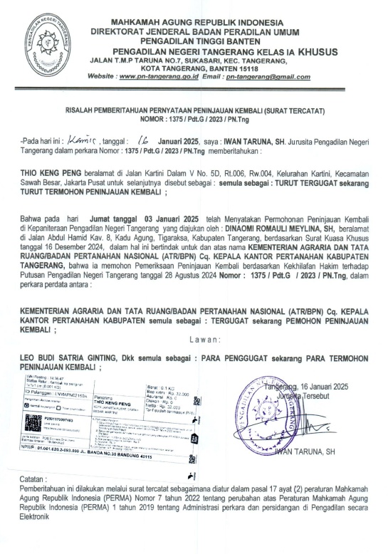RELAAS PEMBERITAHUAN PERNYATAAN PENINJAUAN KEMBALI NO. 1375/Pdt.G/2023/PN Tng KEPADA TURUT TERGUGAT sekarang TURUT TERMOHON PENINJAUAN KEMBALI