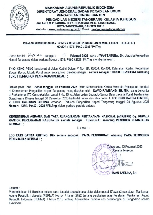 RELAAS PEMBERITAHUAN KONTRA MEMORIE PENINJAUAN KEMBALI NO. 1375/Pdt.G/2023/PN Tng KEPADA TURUT TERGUGAT sekarang TURUT TERMOHON PENINJAUAN KEMBALI