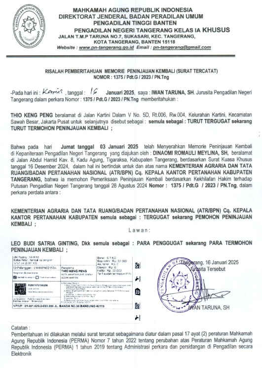 RELAAS PEMBERITAHUAN MEMORIE PENINJAUAN KEMBALI NO. 1375/Pdt.G/2023/PN Tng KEPADA TURUT TERGUGAT sekarang TURUT TERMOHON PENINJAUAN KEMBALI