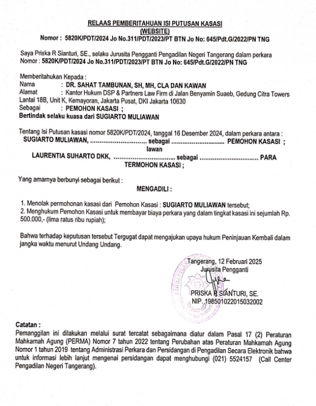 RELAAS PEMBERITAHUAN ISI PUTUSAN KASASI (WEBSITE) NO. 5820K/PDT/2024 Jo NO. 311/PDT/2023/PT BTN Jo NO. 645/PDT.G/2022/PN TNG KEPADA PEMOHON KASASI