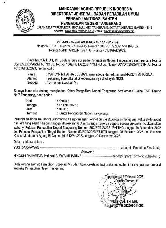 RELAAS PANGGILAN TEGORAN / AANMANING KEPADA TERMOHON EKSEKUSI V NO. 63/PEN.EKS/2024/PN TNG Jo NO. 1382/PDT.G/2021/PN TNG Jo NO. 50/PDT/2023/PT BTN Jo NO. 4616 K/Pdt/2023