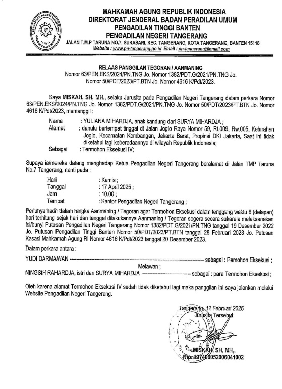 RELAAS PANGGILAN TEGORAN / AANMANING KEPADA TERMOHON EKSEKUSI IV NO. 63/PEN.EKS/2024/PN TNG Jo NO. 1382/PDT.G/2021/PN TNG Jo NO. 50/PDT/2023/PT BTN Jo NO. 4616 K/Pdt/2023
