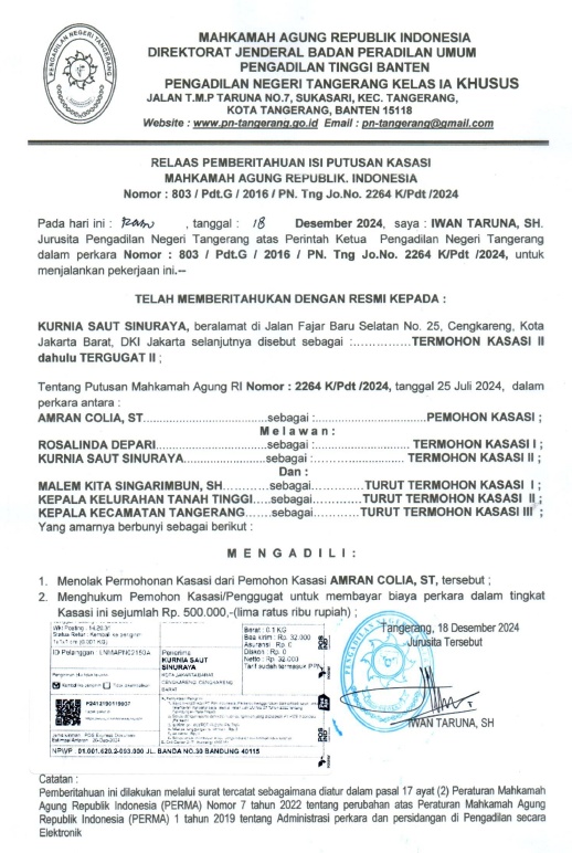 RELAAS PEMBERITAHUAN ISI PUTUSAN KASASI MA RI NO. 803/Pdt.G/2016/PN Tng jo NO. 2264 K/Pdt/2024