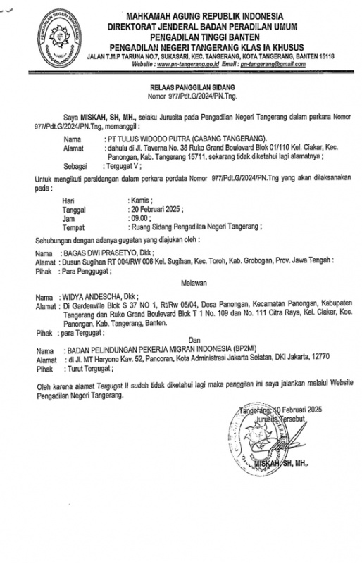RELAAS PANGGILAN SIDANG NO. 977/Pdt.G/2024/PN Tng KEPADA TERGUGAT V