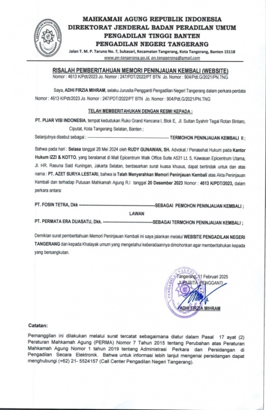 RELAAS PEMBERITAHUAN MEMORI PK NO. 904/Pdt.G/2021/PN Tng TERMOHON PENINJAUAN KEMBALI II