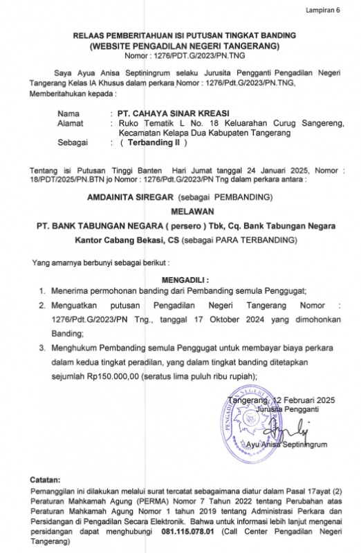 RELAAS PEMBERITAHUAN ISI PUTUSAN TINGKAT BANDING NO. 1276/PDT.G/2023/PN TNG KEPADA TERBANDING II