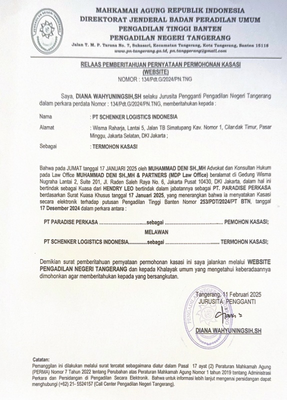 RELAAS PEMBERITAHUAN PERNYATAAN PERMOHONAN KASASI NO. 134/Pdt.G/2024/PN Tng KEPADA TERMOHON KASASI