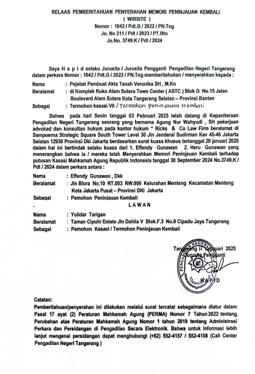 RELAAS PEMBERITAHUAN PENYERAHAN MEMORI PK NO. 1042/Pdt.G/2022/PN Tng jo NO.211/Pdt/2023/PT BTN jo NO.3749 K/PDT/2024 KEPADA TERMOHON KASASI IV / TERMOHON PENINJAUAN KEMBALI