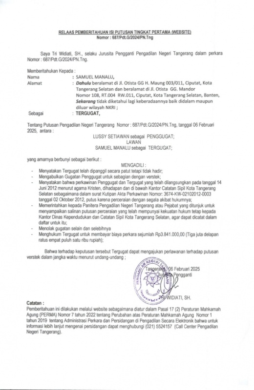 PEMBERITAHUAN PUTUSAN Nomor 687_G_2024_PN Tng (An. SAMUEL MANALU).pdf