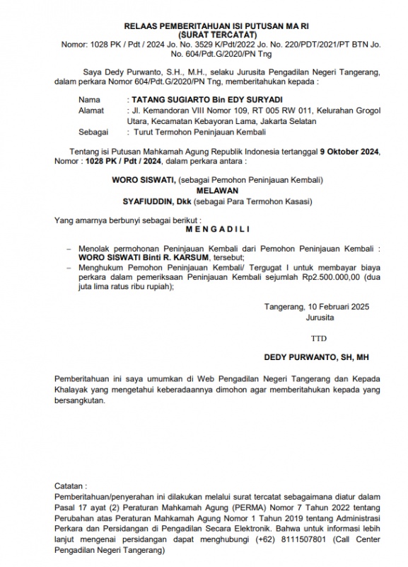 RELAAS PEMBERITAHUAN ISI PUTUSAN MA RI (SURAT TERCATAT) Nomor: 1028 PK / Pdt / 2024 Jo. No. 3529 K/Pdt/2022 Jo. No. 220/PDT/2021/PT BTN Jo. No. 604/Pdt.G/2020/PN Tng