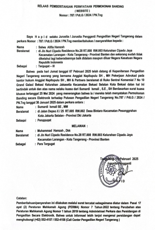 RELAAS PEMBEIRTAHUAN PERNYATAAN PERMOHONAN BANDING NO. 787/Pdt.G/2024/PN Tng KEPADA TERGUGAT III
