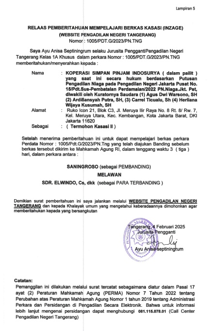 RELAAS PEMBERITAHAUN MEMPELAJARI BERKAS KASASI (INZAGE) NO.1005/PDT.G/2023/PN TNG KEPADA TERMOHON KASASI II