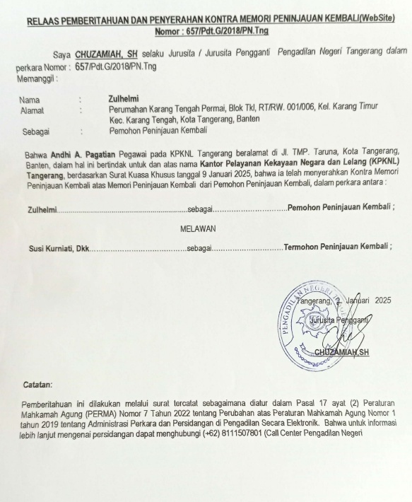 RELAAS PEMBERITAHUAN DAN PENYERAHAN KONTRA MEMORI PENINJAUAN KEMBALI NO. 657/Pdt.G/2018/PN Tng KEPADA PEMOHON PK