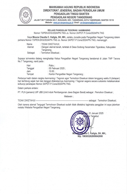 RELAAS PANGGILAN TEGORAN / AANMANING KEPADA TERMOHON EKSEKUSI NO. 73/PEN.EKS/2024/PN TNG Jo NO. 24/PDT.P.Cons/2024/PN TNG