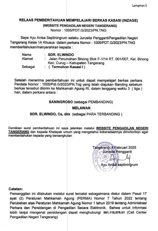 RELAAS PEMBERITAHAUN MEMPELAJARI BERKAS KASASI (INZAGE) NO.1005/PDT.G/2023/PN TNG KEPADA TERMOHON KASASI I