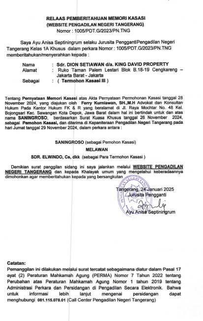 RELAAS PEMBERITAHUAN MEMORI KASASI NO.1005/PDT.G/2023/PN TNG KEPADA TERMOHON KASASI III