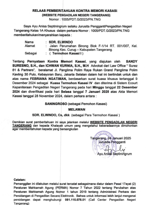 RELAAS PEMBERITAHUAN KONTRA MEMORI KASASI NO.1005/PDT.G/2023/PN TNG KEPADA TERMOHON KASASI I