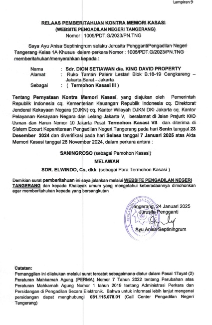 RELAAS PEMBERITAHUAN KONTRA MEMORI KASASI NO.1005/PDT.G/2023/PN TNG KEPADA TERMOHON KASASI III