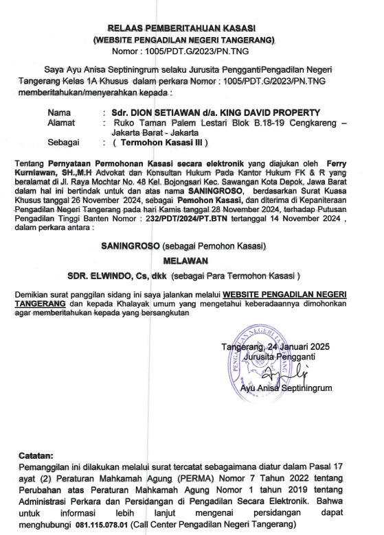 RELAAS PEMBERITAHUAN KASASI NO.1005/PDT.G/2023/PN TNG KEPADA TERMOHON KASASI III