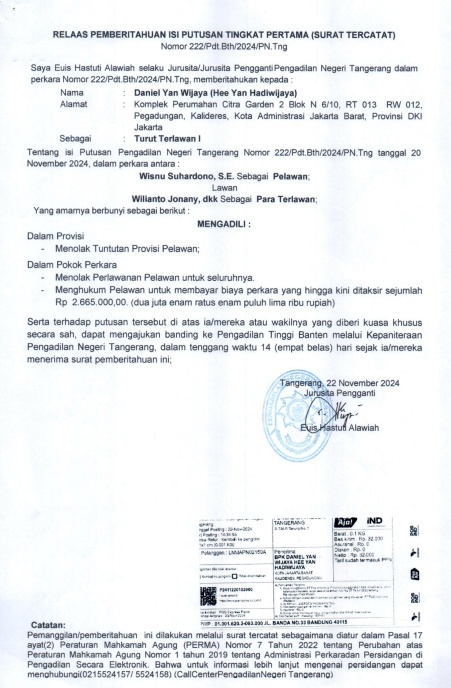 RELAAS PEMBERITAHUAN ISI PUTUSAN TINGKAT PERTAMA KEPADA TURUT TERLAWAN I NO. 222/Pdt.Bth/2024/PN Tng