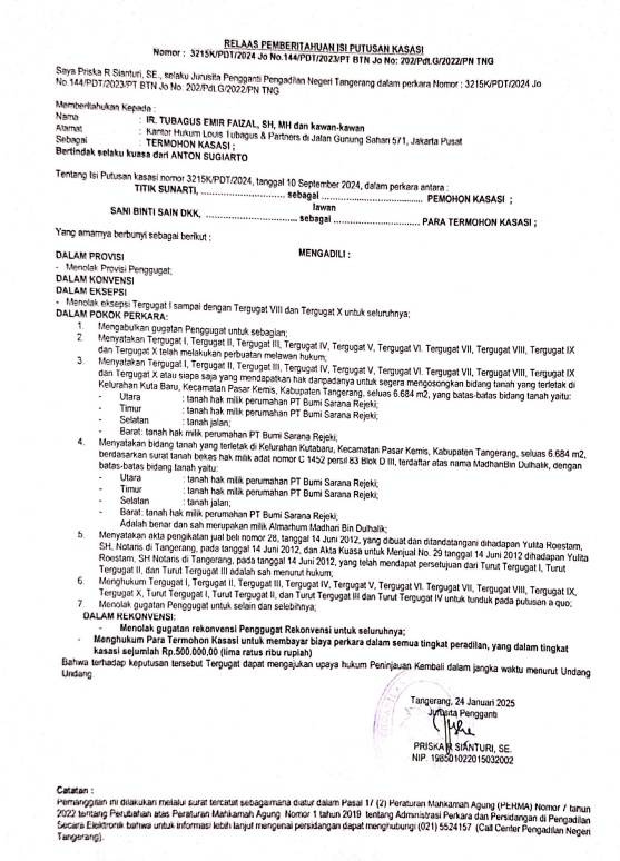 RELAAS PEMBERITAHUAN ISI PUTUSAN KASASI KEPADA TERMOHON KASASI NO. 3215 K/PDT/2024 jo NO.144/PDT/2023/PT BTN jo NO 202/PDT.G/2022/PN TNG