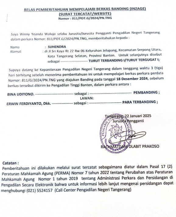RELAAS PEMBERITAHUAN MEMPELAJARI BERKAS BANDING (INZAGE) (SURAT TERCATAT/WEBSITE) NOMOR: 811/PDT.G/2024/PN TNG KEPADA TURUT TERGUGAT I