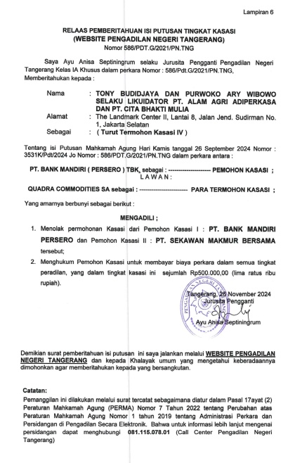 RELAAS PEMBERITAHUAN ISI PUTUSAN TINGKAT KASASI KEPADA TURUT TERMOHON KASASI IV NO. 586/PDT.G/2021/PN TNG