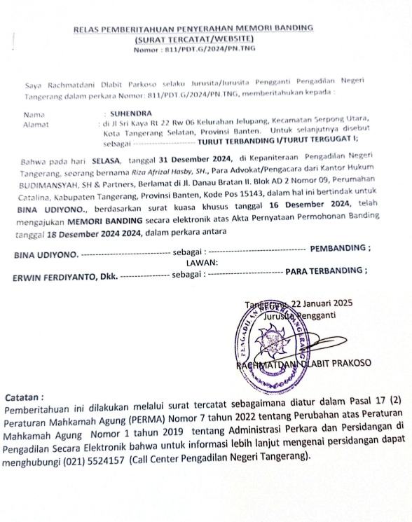 RELAAS PEMBERITAHUAN PENYERAHAN MEMORI BANDING (SURAT TERCATAT/WEBSITE) NOMOR: 811/PDT.G/2024/PN TNG KEPADA TURUT TERGUGAT I